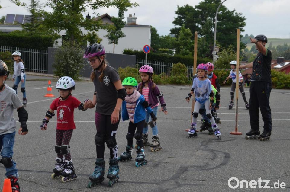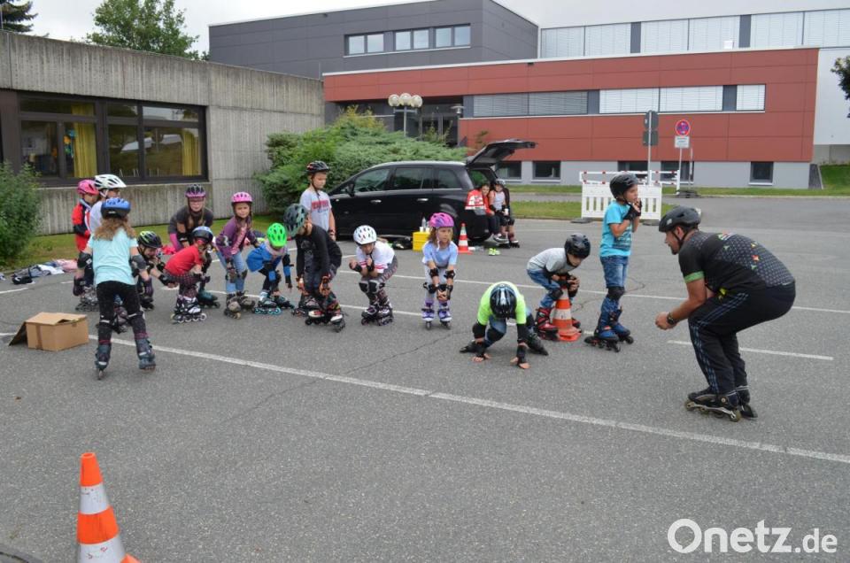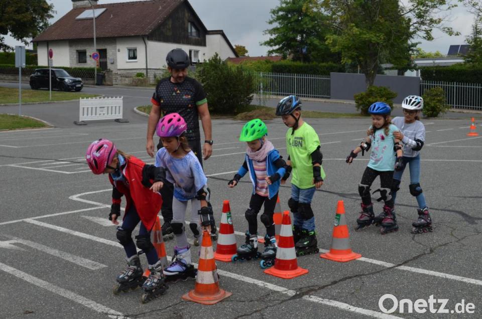 Trainer Martin Fenzl betonte, dass auch einige dabei sind, die noch viel lernen müssen. Mit denen gelte es erste Schritte einzuüben. Fenzl begann mit der Haltung. Gebückt und locker in den Knien sollte sie sein, nicht aufrecht wie eine Kerze. Nach einigen Spielen, bei denen man sich beim Durcheinanderfahren finden musste, richtete Fenzl einen Parcours ein. Die Inlineschüler fuhren Kurven und umrundeten weitere Hindernisse. Sie bestanden teils aus Hütchen oder aus Zeichnungen auf dem Parkplatz. Nur gut, dass alle durch die Ausrüstung entsprechend geschützt waren, denn alle paar Minuten landete eines der Kinder auf den Knien oder dem Hosenboden. Spaß gemacht hat es dennoch.