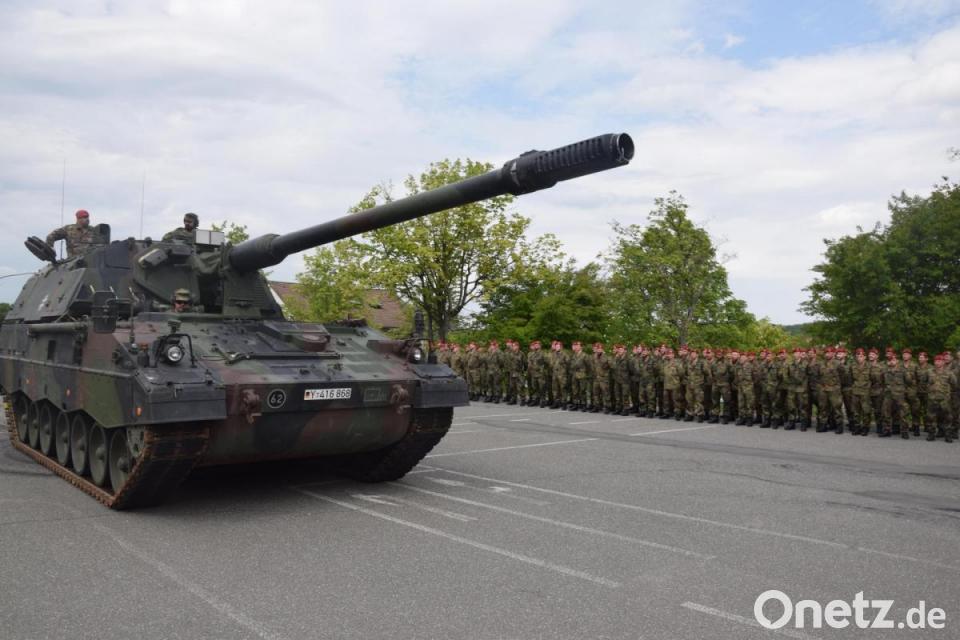 Mit einem militärischen Akt wechselten bei der 4. Batterie des Artilleriebataillons 131 die Dienstgeschäfte des Batteriefeldwebels ("Spieß"). Oberstabsfeldwebel Herbert Walenta übergab bei dem feierlichen Appell auf dem Parkplatz der Schule an Oberstabsfeldwebel Mario Grafe. Dazu säumte schweres Gerät (unter anderem ein Schützenpanzer Marder) das Areal, auf dem die Einheit angetreten war. Unter den Gästen auch Mitglieder des Stadtrates und eine ganze Reihe Bürgerinnen und Bürger. Bürgermeister Karlheinz Budnik freute sich, dass dieser feierliche Stabwechsel in der Patenstadt vollzogen wird.