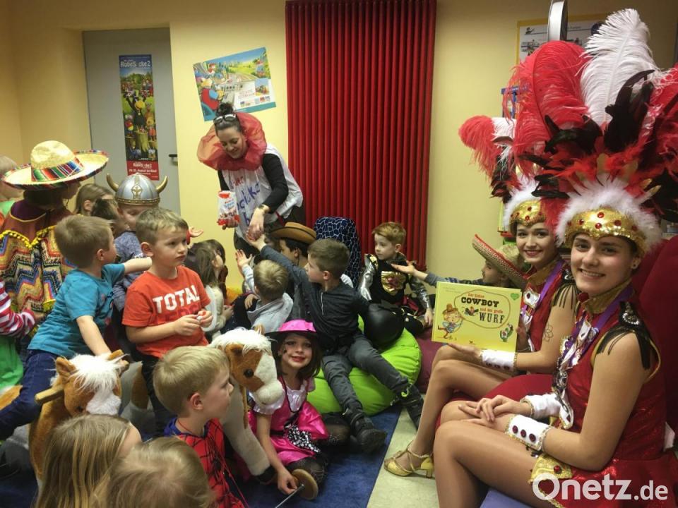 Zauberer, Mexikaner, Hexen, Feen, Ritter, ein Schneemann und ein Cowboy waren in die Stadtbücherei zur Faschings-Vorlesestunde gekommen. In die Rolle der Lesepaten schlüpften diesmal die beiden Gardemädchen Anna und Carla. Sie lasen aus dem Buch "Der kleine Cowboy und der große Wurf" vor. Katja Stessmann vom Ortsjugendwerk hatte sich nicht nur als „Schokobon" verkleidet, sondern verteilte diese Leckereien auch an die Mädchen und Buben. Passend zum Thema bastelten die Kinder im Anschluss ein Steckenpferd.