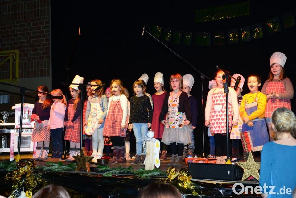 Zum Auftakt sangen die Jüngsten aus der 1a das Lied „In der Weihnachtsbäckerei“. Sie hatten auch „alle Zutaten“ mitgebracht, die in eine Backstube für Weihnachtsplätzchen gehören. Die 1b trug das Gedicht „Ich freu mich so auf Weihnachten und frag die ganze Zeit, wann ist denn endlich Weihnachten, wann ist es nur so weit?“ vor. Und diese Frage beantworteten die Kinder auch gleich. Doch zuvor musste erst noch ein Kontrolleur die Heizung überprüfen, ein Weihnachtsbaum besorgt werden, der Pulli noch fertig gestrickt, die Plätzchen gebacken und ein Weihnachtslied eingeübt werden.