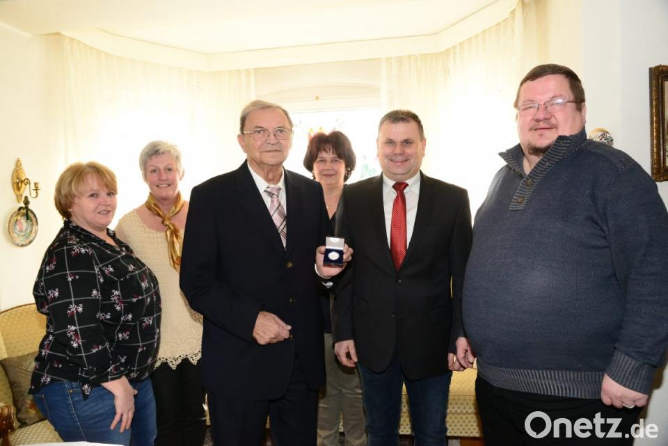 Bürgermeister Karlheinz Budnik gratulierte dem Jubilar mit einem besonderes Geschenk, der Stadtmedaille in Silber. Enders freute sich sichtlich über diese gelungene Überraschung. Pfarrer Hubert Bartel wünschte Gottes Segen.