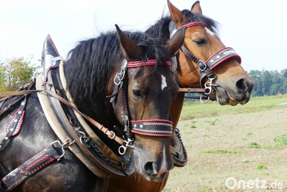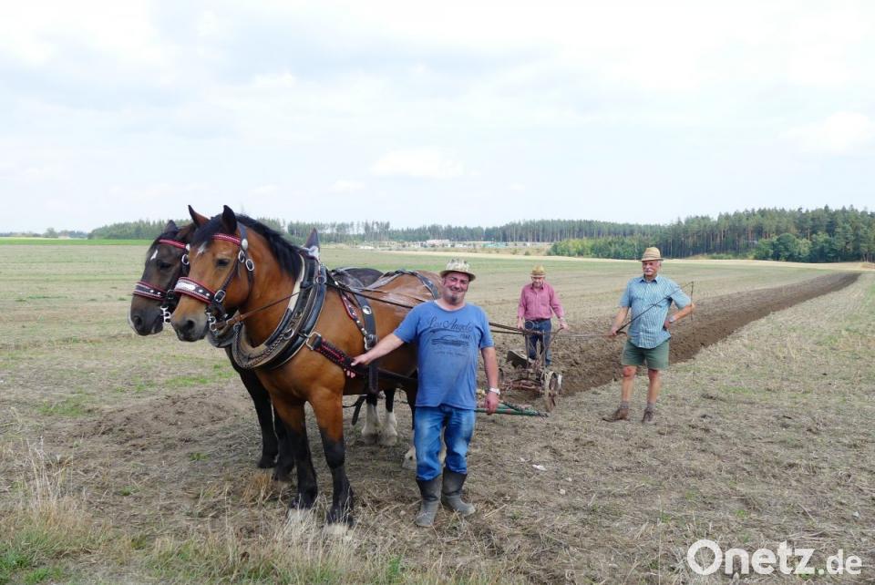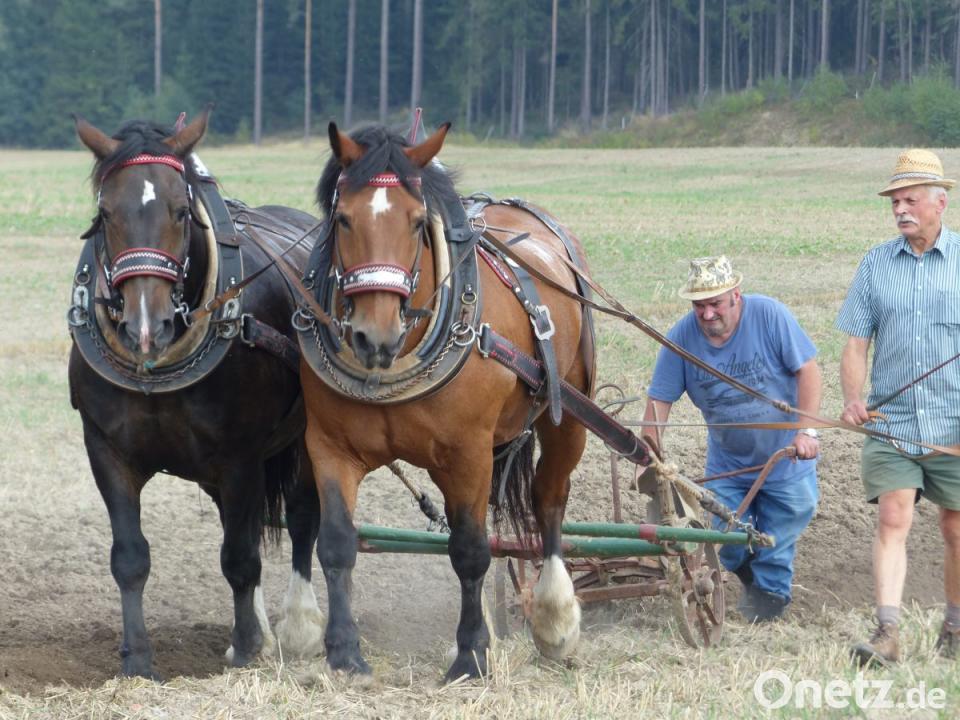 "Sternchen" und "Kuba" trotten über das Feld. Die schweren Kaltblutpferde von Joe Stangl aus Bernstein ziehen an diesem Tag keine Kutsche ins Waldnaabtal, sondern einen Pflug von anno dazumal. Das alte Ackergerät aus Eisen besteht aus zwei Rädern, Haltegriffen und einer Schar. Auch wenn die Pferde scheinbar mühelos den Pflug schleppen, ist es für die Menschen, die hinterherstapfen, kein Zuckerschlecken.
