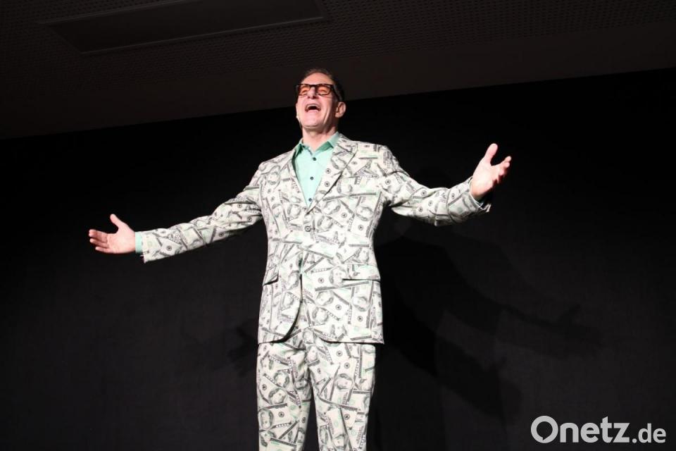 "Was für eine Energie, was für ein Charisma, was für ein Anzug", mögen die 40 auserwählten "Seminarteilnehmer" bei der Futura gedacht haben, als er sie in der Rolle des Börsen-Gurus vereinnahmte. In seiner Show tauchte er als Synthese aus Christian Lindner und Karl Lauterbach tief in die Geheimnisse der "Homöopathie des Geldes" ein, erklärte, wie man in sieben Schritten zum Millionär wird und nahm das Publikum mit auf eine humorvolle Reise in die verrückte Welt der Finanzen. Dazu gehört am Ende auch ein "Cum-Ex-Dance" gemeinsam mit den Zuschauern Michl, Michael und Margarethe.
