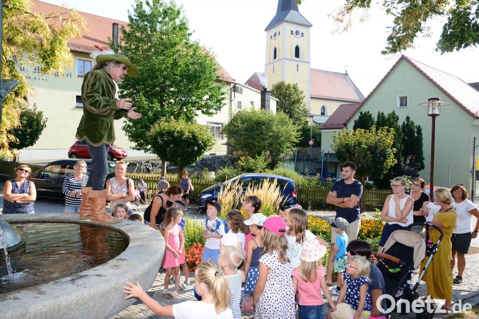 Der Theaternachmittag begann am Windischeschenbacher Stadtbrunnen. Hoch oben auf dem Beckenrand und somit für Groß und Klein bestens zu sehen, erzählte Rupprecht vom „gestiefelten Kater“. Eine schwarze Nasenspitze, der graue Schnauzbart und hohe braune Stiefel machten aus ihm die Märchenfigur. Theatralisch berichtete er vom sprechenden Kater, den der Sohn eines Müllers als Erbe erhalten hatte. Das Tier gab seinem Besitzer den Rat, für ihn Stiefel zu besorgen, statt sich Handschuhe aus dem Fell machen zu lassen. Und so nimmt die Geschichte ihren Verlauf: Der Kater fängt Rebhühner für den König, besorgt seinem Besitzer mit Hinterlist den Zugang zum Königshof und sein Herrchen wird am Ende König, der „gestiefelte Kater“ der erste Minister. Spielerisch zeigt das Stück differenziert Ungerechtigkeiten beim Erbe auf, vermittelt Zeichen der Dankbarkeit und des Glücks.