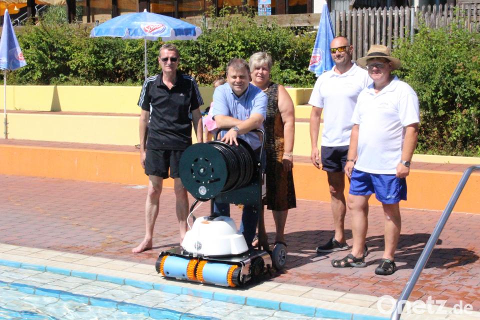 (mic) Wenn am Abend die Besucher nach Hause gegangen sind, beginnen im Freibad die Reinigungsarbeiten. Auch die Fliesen in den Becken werden geputzt - nicht mit der Hand, sondern mit einem Beckensauger, der ähnlich wie ein Rasenmäher-Roboter seine Arbeit selbstständig erledigt. Da das alte Geräte in die Jahre gekommen war und nicht mehr funktionierte, war es an der Zeit ein Neues anzuschaffen. Der Freibadförderverein finanziert den notwendigen Kauf für 8600 Euro. Bürgermeister Karlheinz Budnikdankte den Vorsitzenden Aurelia Zimmermannund Josef Hartmannund wünschte den Bademeistern gutes Gelingen.