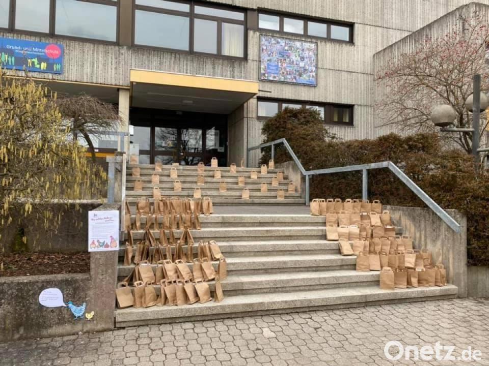 Am Gründonnerstag konnten sich die Kinder ein Starterset kontaktlos am Haupteingang der Grund-und Mittelschule abholen. Für insgesamt 150 Kinder waren eine Bastelanleitung, ein Lauf- und Rätselzettel sowie ein weißes Plastik-Ei, ein Stift und ein Brief vom Osterhasen vorbereitet. Alle Tüten wurden auf den Treppen vor der Schule bereit gestellt und von gespannten Mädchen und Buben im Zeitraum von 14 bis 18 Uhr abgeholt.