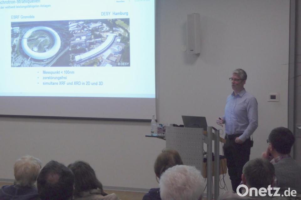Seine Ausführungen bereicherte Professor Brenker mit Bildern, Videofilmen, einem Box-Modell aus dem 3-D-Drucker und Gegenständen wie einen Meterstab zur Veranschaulichung der Körnergröße oder einem mit Aluminium umhüllten Tennisschläger als Modell für einen Partikel-Auffangbehälter einer Sonde. Ihr großes Interesse an dem Inhalt seines Vortrags zeigten die Besucher auch mit einer Vielzahl von Fragen an den Referenten.