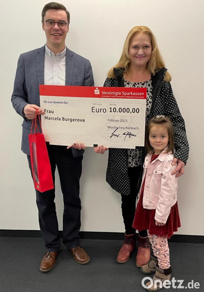 Marcela Burgerova kann sich über 10.000 Euro freuen. Sie hat beim PS Sparen der Vereinigten Sparkassen Eschenbach, Neustadt, Vohenstrauß bei der Auslosung für den Sparmonat Januar einen Hauptgewinn erzielt. Filialdirektor Michael Schelkshorn gratulierte Burgerova und überreichte ihr zusammen mit einer Flasche Wein symbolisch einen großen Scheck. Das Geld will die Gewinnerin für so manchen kleinen oder größeren Wunsch für sich selbst oder für ihre Tochter verwenden.