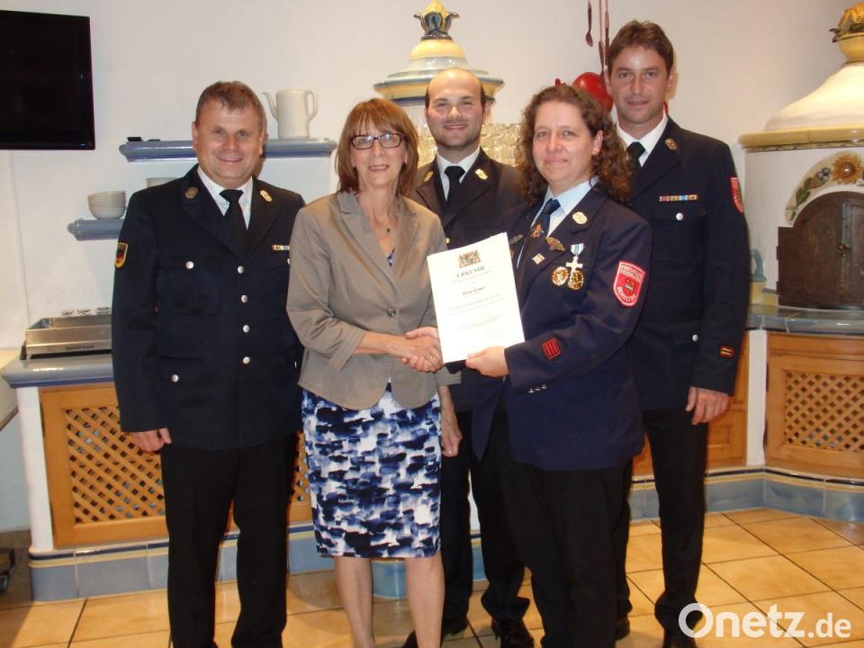 Besonders positiv von allen Rednern erwähnt, da derzeit noch eine Besonderheit innerhalb der Feuerwehren, wurde die einzige weibliche Geehrte, Anita Greger von der Bernsteiner Wehr. Seit 25 Jahren tut sie Dienst. Und während bei den Männern jeweils eine starke Frau dahinter stehe, wurde der Feuerwehrfrau ein starker Mann an ihrer Seite diagnostiziert.