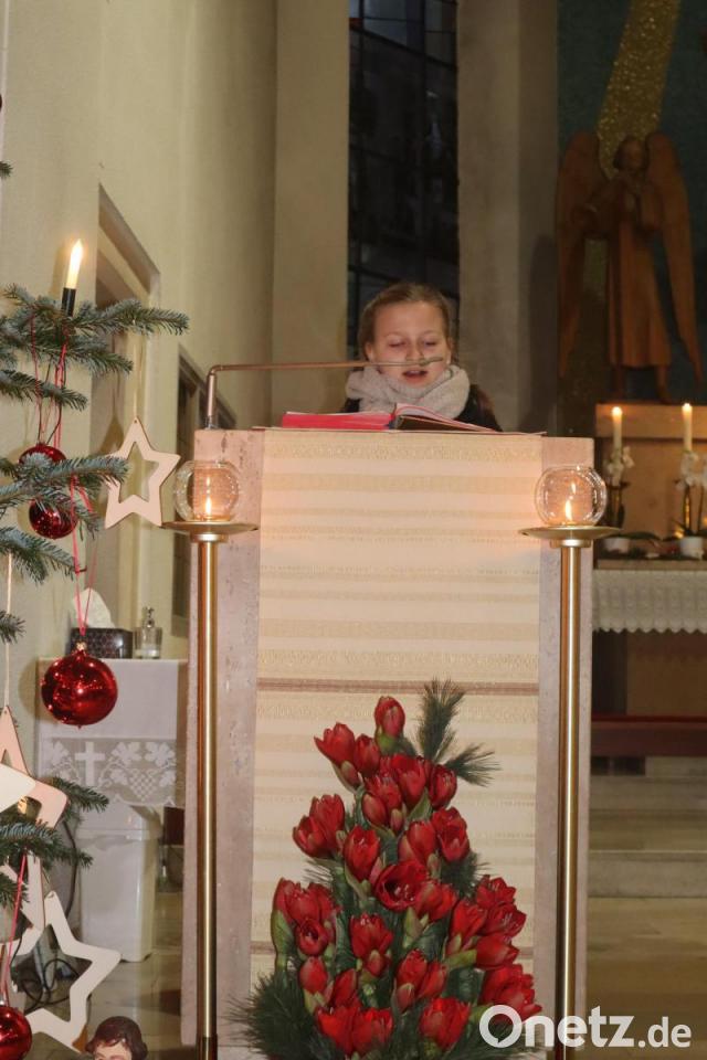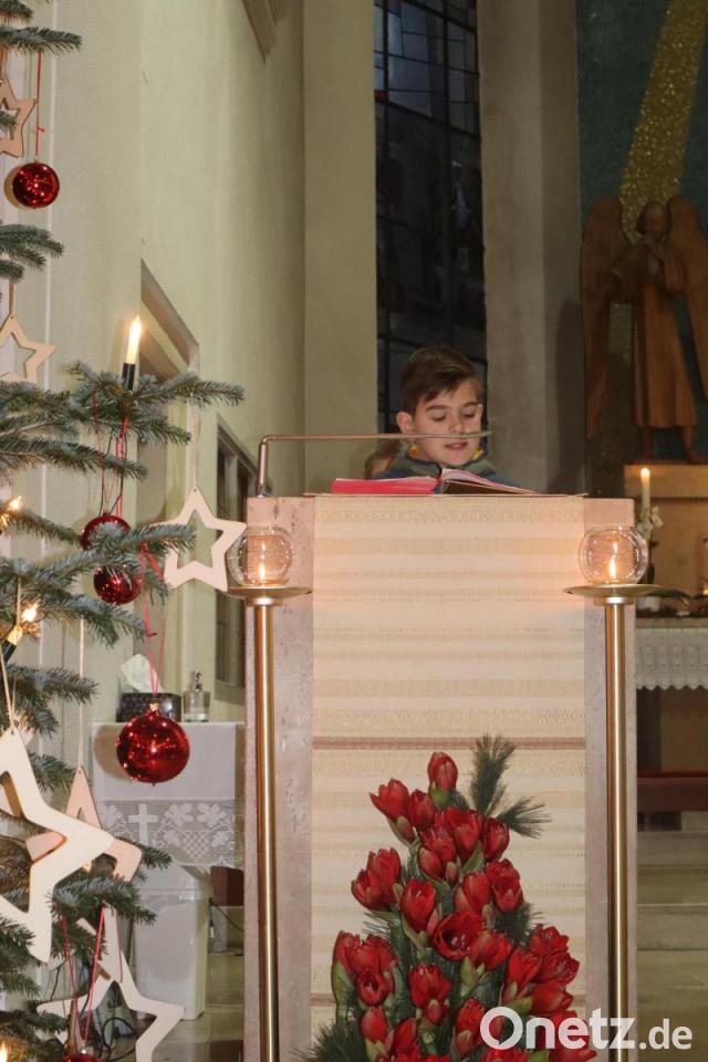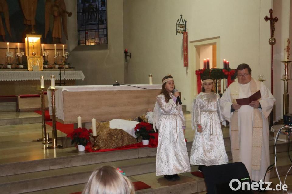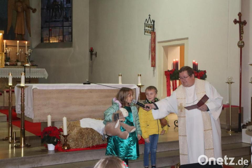 Ganz ohne Kinder ging es aber auch nicht: Zwei Kinder lasen das Weihnachtsevangelium vom Ambo aus vor. Außerdem brachten Kinder ausgewählte Gegenstände zum Altar im Rahmen der Fürbitten. Beispielsweise brachte ein Mädchen das Jesus-Kind zur Krippe: Sie bat für alle Kinder auf der Welt, dass Gott sie beschütze. Zwei Engel baten für alle Menschen, dass sie die frohe Botschaft hören. Auch ein Ochs und ein Esel als Stofftier wurden zum Altar gebracht. Sie sprachen für die armen und notleidenden Menschen.