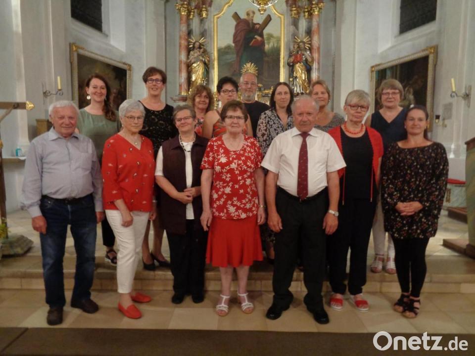 Pfarrer Eugen Wismeth, Chorleiter Hans Bock und Regionalkantor Florian Schuster überreichten Urkunden der Pfarrei beziehungsweise der Diözese an Sabrina Rosenberger (16 Jahre), Elisabeth Fröhlich (20 Jahre), Bernd Hildebrand (23 Jahre), Veronika Gruber (29 Jahre), Monika Fichtinger (33 Jahre), Monika Hildebrand (37 Jahre), Gabi Zapf (37 Jahre), Christa Harris (40 Jahre), Anita Schöberl (41 Jahre), Erna Karl (42 Jahre), Margareta Wagner (53 Jahre), Alfons Fuchs (55 Jahre) und Berta Bock (56 Jahre). Für 60 Jahre wurden Emma Hildebrand als Chorsängerin und Hans Bock als Chorleiter, Sänger und Organist geehrt.