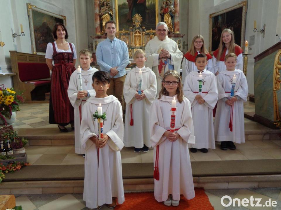 Pfarrer Eugen Wismeth hieß die Eltern und Paten der Kinder sowie Rektorin Christine Losch, Klassenlehrer Andreas Waldmann und die ehemalige Religionslehrerin Annemarie Mösbauer zu einem "doppelten Fest" willkommen – neben Erstkommunion wurde auch noch Erntedank gefeiert.