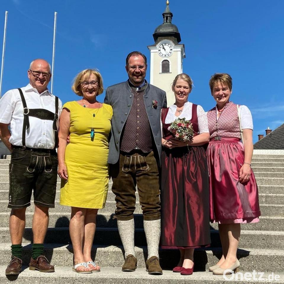 Coronabedingt fand die Feier nur in einem kleinen Rahmen statt. Nach einer Andacht in der Pfarrkirche in Winklarn folgte die standesamtliche Trauung im Kulturhof von Neuhofen, einem Ortsteil von Ybbs an der Donau. Bei der Feier in der Moststube Phiringer überbrachte Sonja Meier in Reimform die besten Wünsche aus der Oberpfalz. An die Braut, die nun Sabine Dorner-Leyerer heißt, und ihren Ehemann Josef Leyerer überreichte sie einen Gutschein für ein Wochenende in der Gemeinde, eine Flasche "Muschariada Sprätza" sowie zwei Schnapsgläser mit dem Winklarner Wappen.