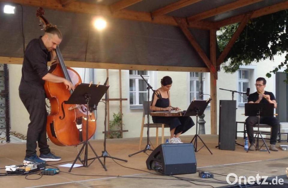 Auf der Bühne am Marktplatz trafen die beiden aus Syrien stammenden Musiker Mohamad Fityan mit seinen Bambusflöten und Leila Mahmoud am orientalischen Psalter ("Qanun") mit Kontrabassist Jonathan Sell zusammen, einem Meister der Jazz-Improvisation. Das Trio wolle nicht nur Musik machen, sondern mit ihrer Begegnung "etwas Neues Gemeinsames schaffen", hieß es. Die Verbindung zwischen dem Westen und dem Orient wurde musikalisch aufgebaut.