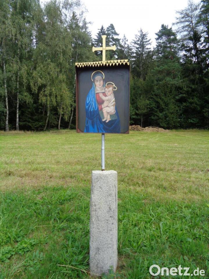Als Motiv wählten die Besitzer wieder die Mutter Gottes mit Jesuskind. Kreuz, das Vordach in Blechschnittweise und die Heiligenscheine von Maria und dem Jesuskind fasste der Künstler in Gold. Der gestaltete Blechkasten ist mit einer Eisenstange in einem Granitsockel verankert. Die Mutter Gottes schaut herab, als wollte sie den vorbeigehenden Wanderer segnen und ihren Schutz anbieten. Für die Wiederherstellung dieses Kleinods gebührt der Familie Schmaderer großer Dank. Sohn Thomas möchte die Prozessionsfahne demnächst noch mit zwei Buchsbäumen einrahmen.