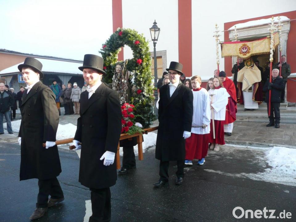 Die Heiligenfigur, die sich das Jahr über im Altarraum befindet, wird dazu mit Blumen, Münzen und Rosenkränzen geschmückt und von vier jungen Männern mit Frack und Zylinder auf einem Gestell in die Kirche getragen. Vor der Corona-Pandemie gestaltete sich der Einzug in das Gotteshaus im großen Rahmen, ebenso die eucharistische Prozession am Ende des Gottesdienstes mit Geistlichkeit, Fahnenabordnungen der Vereine, kirchlichen und weltlichen Gremien. Dazu spielte die Blaskapelle Kunschir.