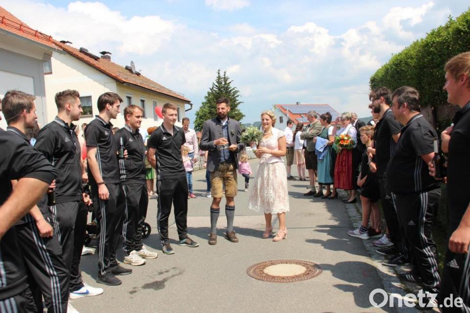 Natürlich ließen es sich die Freunde von Kerstin und Benedikt nicht nehmen, den Frischvermählten nach der Trauung zu gratulieren. Sie bildeten – zusammen mit den Fußballern des TSV Winklarn, bei denen der Bräutigam Mitglied ist – ein Ehrenspalier, gratulierten und wünschten alles erdenklich Gute zur Hochzeit. Gemeinsam ließen sie Reis regnen und zusammen mit dem Brautpaar rote Luftballons in Herzform steigen.