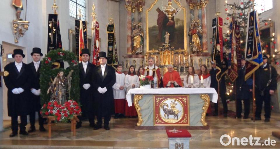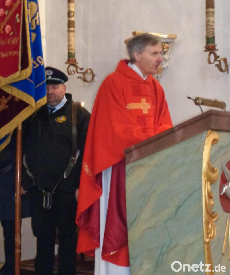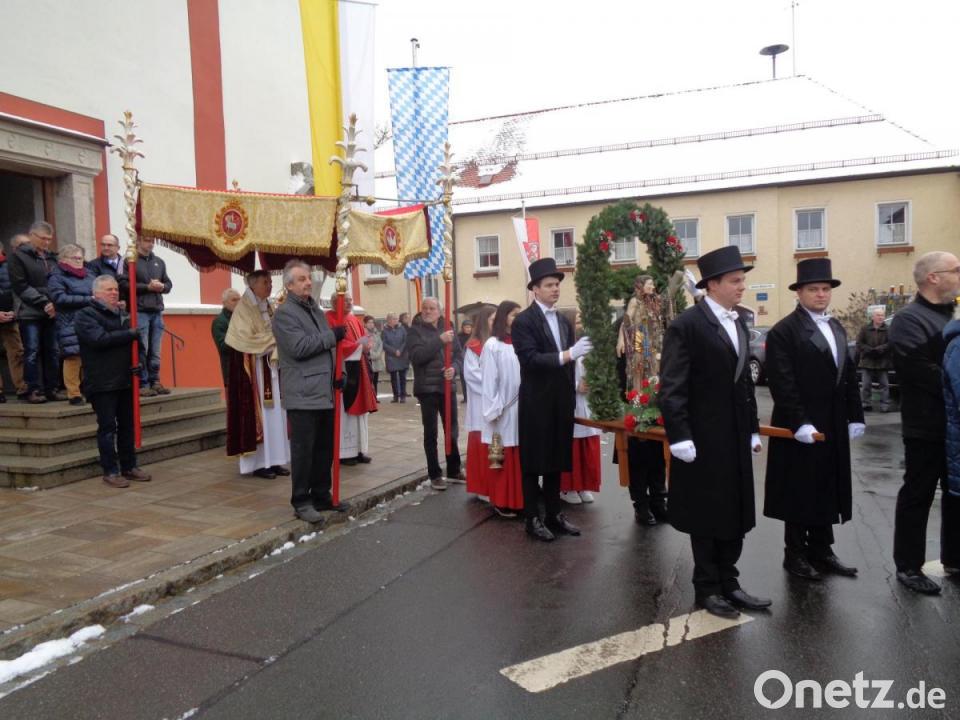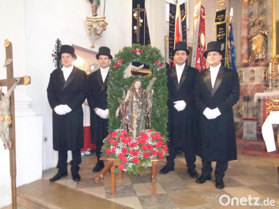 Die Feier des Gelöbnisses findet immer nach einem genauen Ritus statt. Unter den Klängen der Blaskapelle Kunschir trugen vier junge Burschen in Frack und Zylinder die geschmückte Statue des heiligen Sebastian in Begleitung der Geistlichkeit, der kirchlichen und weltlichen Gremien und der Vereine von der Mariensäule in die Kirche. Der Kirchenchor stimmte die Gläubigen auf den Festgottesdienst ein. Pfarrer Eugen Wismeth begrüßte Bürgermeisterin Sonja Meier mit dem Marktrat, die Vereine mit ihren Fahnenabordnungen, die Träger der Sebastians-Statue und natürlich den Hauptzelebranten und Festprediger, Spiritual Matthias Effhauser aus Regensburg.