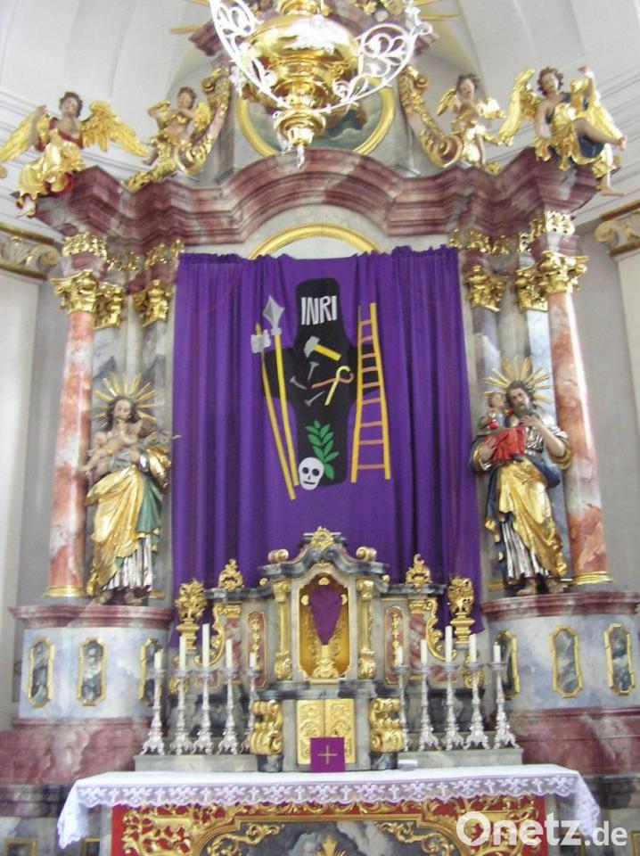 In diese Arbeiten war die jetzige Mesnerin Marianne Strecker schon mit eingebunden. Die beiden Frauen entschlossen sich, die Motive mit Hand aufzunähen, um den Halt zu garantieren. Das Nähen auf den großen Vorhängen zeigte sich als sehr schwierig und mühsam, wie Marianne Strecker heute noch erzählt. Für die drei Altäre gestalteten die zwei Frauen die Tücher. Die Marterwerkzeuge am Hochaltarvorhang verdeutlichen den bitteren Leidensweg Jesu. Am Tuch für den linken Seitenaltar sind die Werkzeuge der Geißelung aufgenäht. „Sie werfen das Los um mein Gewand“ ist am rechten Seitenaltar dargestellt.
