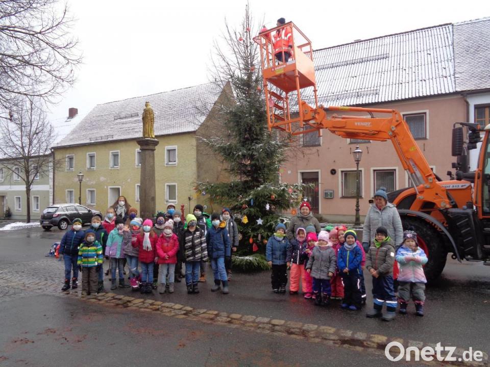 Mit Hilfe des Bauhofes erhielt der Baum seinen bunten Schmuck. Die unteren Äste schmückten die Buben und Mädchen selber, bei den oberen half Alfons Linsmeier mit Hilfe einer Arbeitsbühne. Nach getaner Arbeit dankte die Familienbeauftrage Andrea Kunschir den kleinen Künstlern im Namen der Bürgermeisterin Sonja Meier und verteilte kleine Schoko-Lutscher als süßen Lohn für die Mühen.