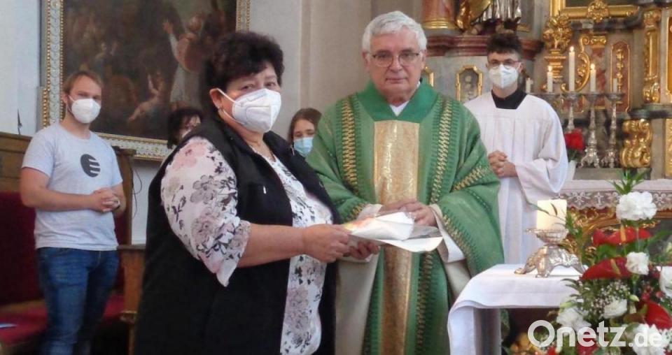 Im Rahmen des Sonntagsgottesdienstes überreichte der Ortsgeistliche die Urkunde und eine Kerze des Bischofs an Marianne Rötzer. Anna Kulzer bringt Pfarrer Eugen Wismeth die beiden Geschenke persönlich vorbei.