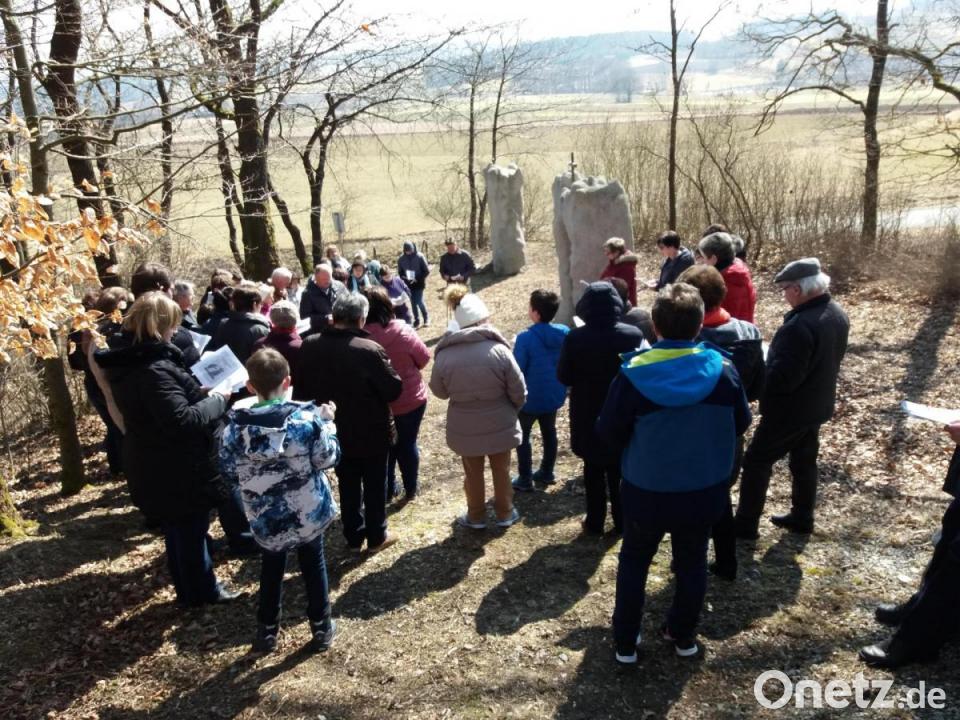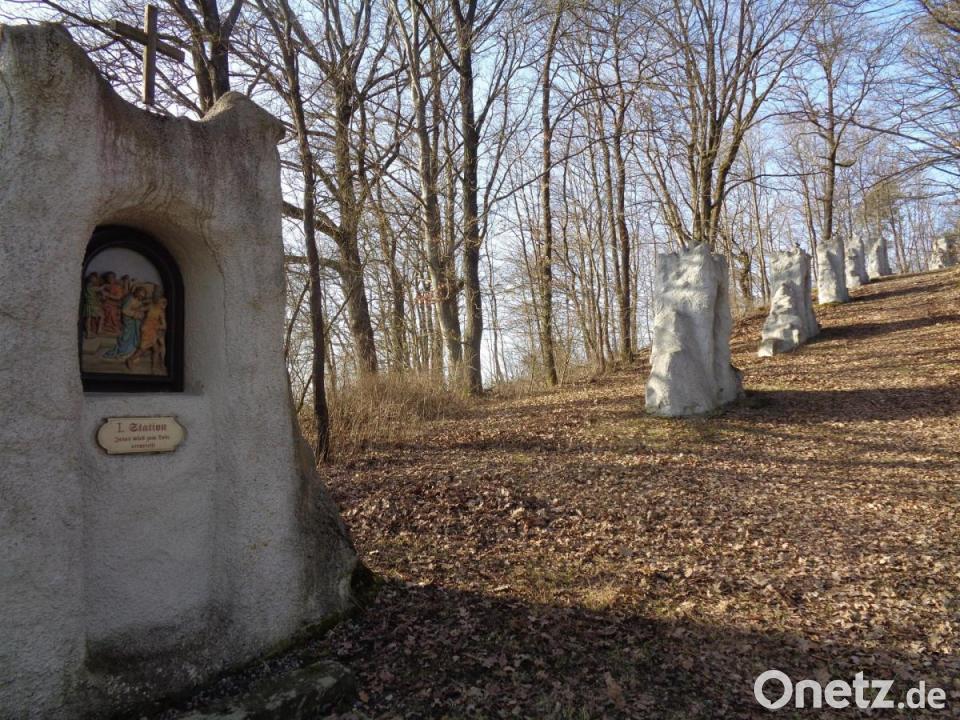 So führen die einzelnen Stationen hinauf nach Golgotha – wie es in der Bibel heißt – bis zur zwölften Station, der größten und mächtigsten mit einer Aussichtsplattform. Bei schönem Wetter sieht man nach Westen bis Dieterskirchen und nach Osten bis Irlach. Auf dem Rundweg geht es dann weiter Richtung Norden vorbei an der Grablege Jesu. In einer gemauerten Höhle ruht die Figur des toten Christus, geschützt mit einem eisernen Gitter.