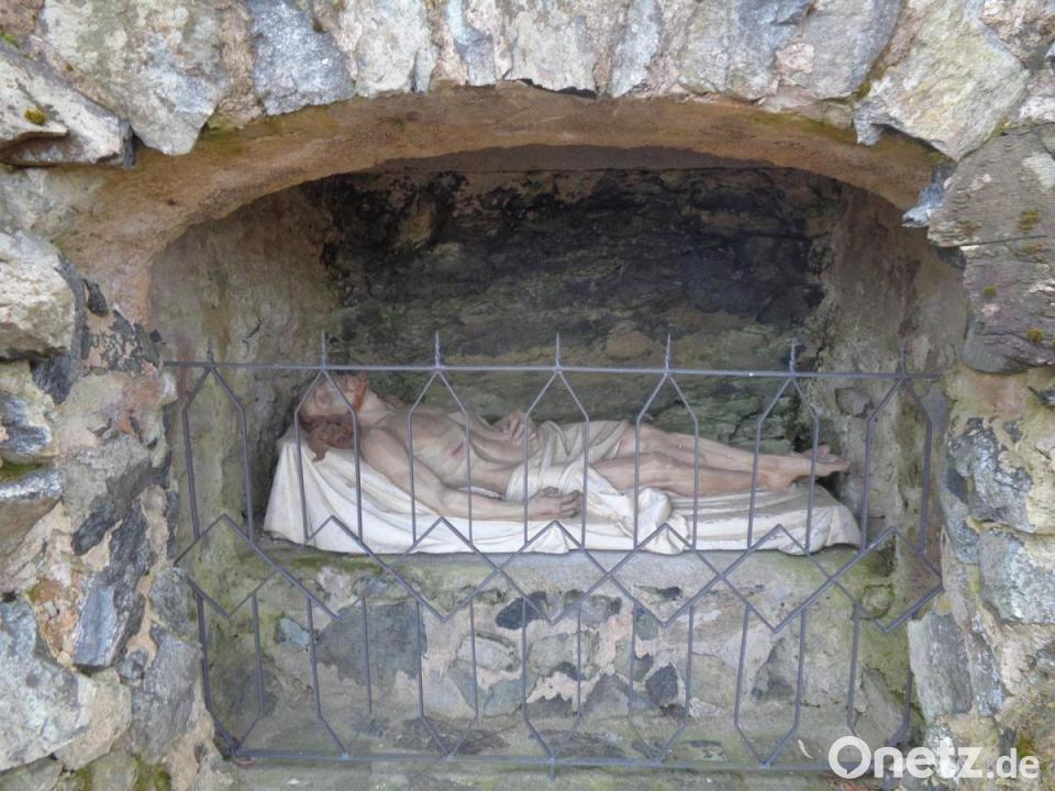 Die lebensgroße Figur des Grabchristus, von einem Oberammergauer Holzschnitzer gefertigt, spendete 1935 die Landsmannschaft München ihrer Heimat. Pater Dagobert Stöckerl, ein Landsmann, weihte am 11. August 1935 anlässlich eines Heimatfestes den renovierten Kalvarienberg und die Christusfigur bei einer Feldmesse vor der zwölften Station feierlich ein.