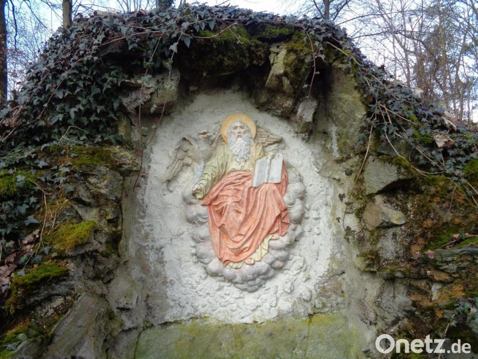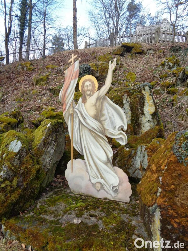 Eine Blechschnittfigur des auferstandenen Heilandes mit Blickrichtung Osten zur aufgehenden Sonne steht unterhalb der zwölften Station am Rundweg. Zurück zur ersten Station geht es vorbei an der Grotte mit Johannes auf Patmos. Dieses Relief aus Steinzeug-Guss wurde ebenfalls von Oberlehrer Johann Metzler geschaffen. Dank mehrerer Renovierungen und Pflegemaßnahmen in den letzten über hundert Jahren wurde dieses Kulturdenkmal gepflegt und erhalten.