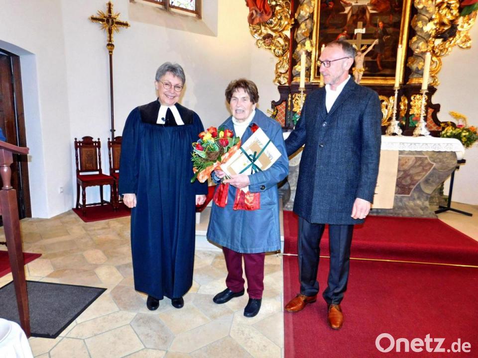 Zuvor hatten Pfarrerin Friederike Steiner und Vertrauensmann Werner Schlöger im Namen der Kirchengemeinde und des Kirchenvorstandes Wirbenz/Kemnath/Immenreuth der in Thann geborenen 83-Jährigen mit einer Laudatio und Geschenken überrascht. Unter langanhaltendem Beifall übergaben sie einen Blumengruß, Gutschein und Urkunde mit dem Blick von der Empore auf den Altar und Kirche sowie einem Vater-Unser-Kreuz als Motive.