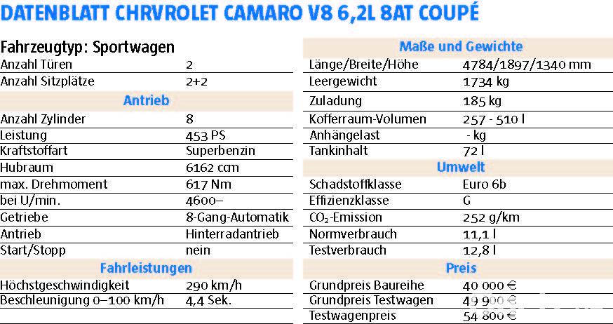 "Er", das ist ein Camaro, Nachname Chevrolet, gebaut und ersonnen in den USA und im Verhältnis sehr günstig. Er ist begehrenswert, weil brutal in seinen Fahrleistungen und umrankt von Legenden. Ein "Pony"-Car, wie die Amis sagen und seit jeher direkter Konkurrent des Ford Mustang. Unter der Haube ein V8 "Smallblock" mit mehr als sechs Litern Hubraum und 453 PS. Noch Fragen?