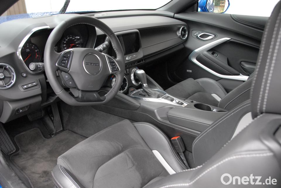Schälen wir uns hinein in das Sportcoupé, das in der Lackierung "Hyper Blue Metallic" (800 €) anrollt.Die Recaros (1900 €) umklammern deinen Körper. Startknopf drücken und jubeln: Bescheidenheit geht anders. Der Camaro schreit auf, bollert und sprotzelt dann, wie es eben nur ein V 8 kann und ein Soundaktuator niemals hinbringen wird. Acht Gänge stehen zur Wahl, und die wechselt der Blaue automatisch, schnell und präzise. Wer mag, kann über Paddel manuell schalten. Was passiert beim Kickdown? Der Camaro brüllt, der Camaro scharrt, und der Camaro springt. Und zwar auf seinen 20-Zöllern nach vorne ohne Wenn und ohne Aber. Leichtfüßig. Wegen des Heckantriebs die Nase anhebend, als möchte er abheben. Gleich. In diesem Moment.