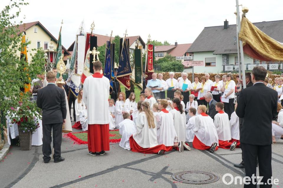Nach dem Gottesdienst, den Pfarrer Michael Hoch wegen des unsicheren Wetters in der St. Michael Kirche gefeiert hatte, machte sich die Prozession auf zu den vier Altären. Auch die Kommunionkinder und viele Ministranten begleiteten das Allerheiligste auf dem Weg durch die mit Fahnen und Birken geschmückten Straßen von Wolfring. Musikalisch gestaltete der Kirchenchor und die Jugendblaskapelle den Gottesdienst und die Prozession. Pfarrer Hoch betete mit den Gläubigen an den vier Altären. Zum Abschluss versammelten sich die Teilnehmer am Dorfplatz um beim von der Jugendblaskapelle organisierten Frühschoppen das Fest ausklingen zu lassen.