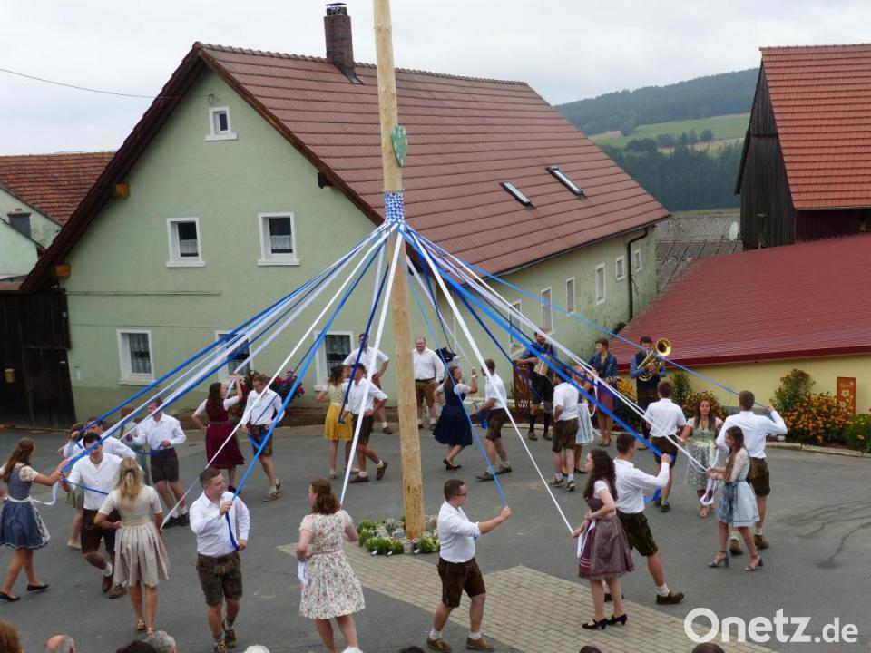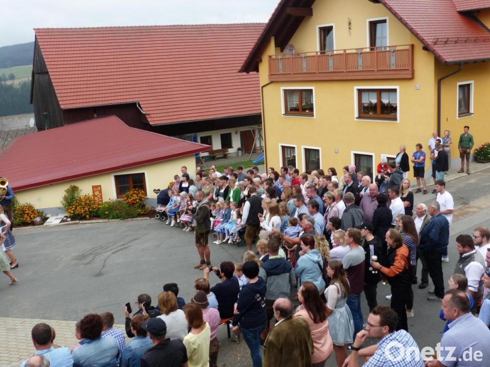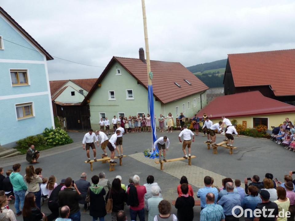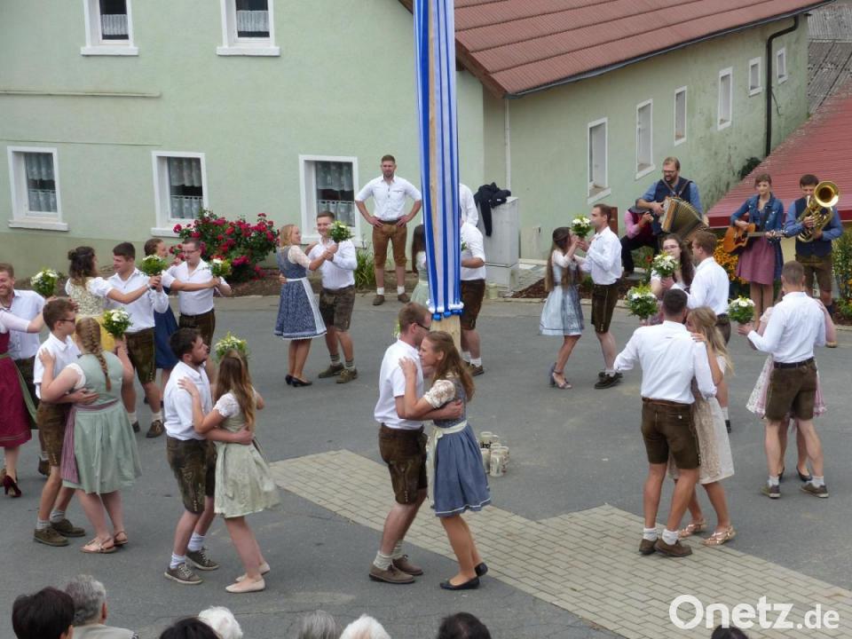 Das Musikanten-Trio „Die jungen Wittschauer“ führten den Zug der Kirwaleit an und geleiteten sie mit Marschmusik zum Dorfplatz. Dort führten die 12 Paare Tänze um den Baum auf. Höhepunkt war der Bandltanz. Die Anzahl der Besucher war diesmal enorm. Sogar Gäste aus Frankreich standen im weiten Rund mit dabei. Das Schauspiel um den Kirwabaum wollten alle sehen.