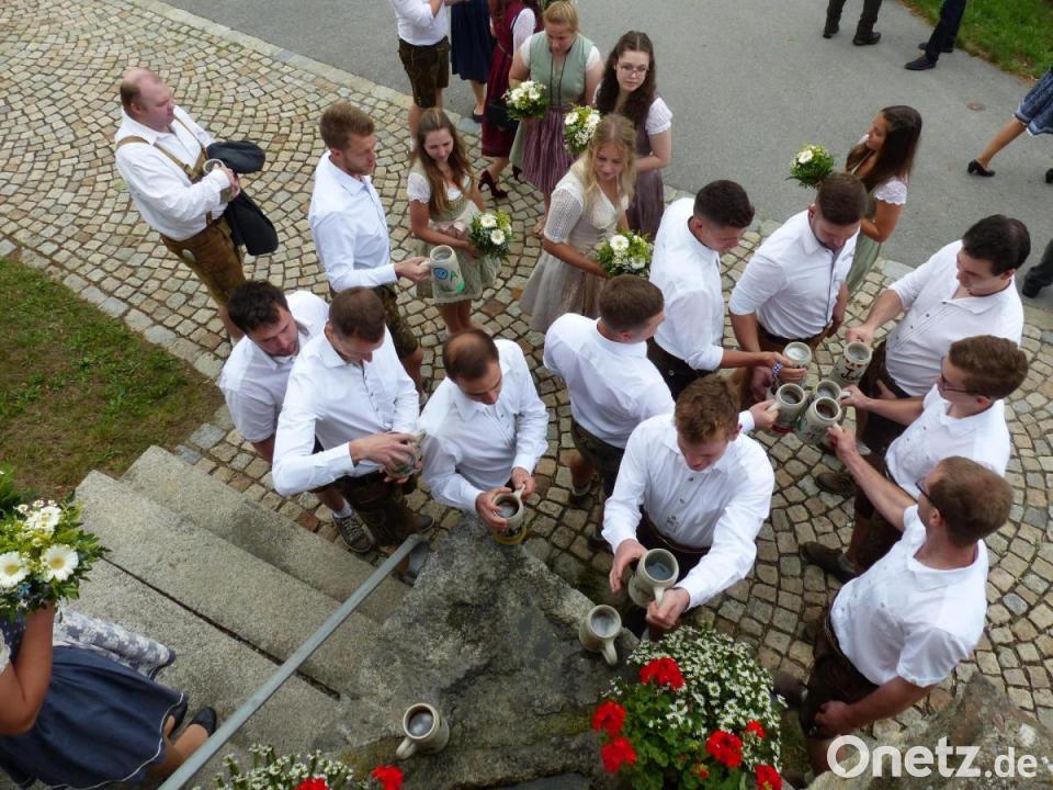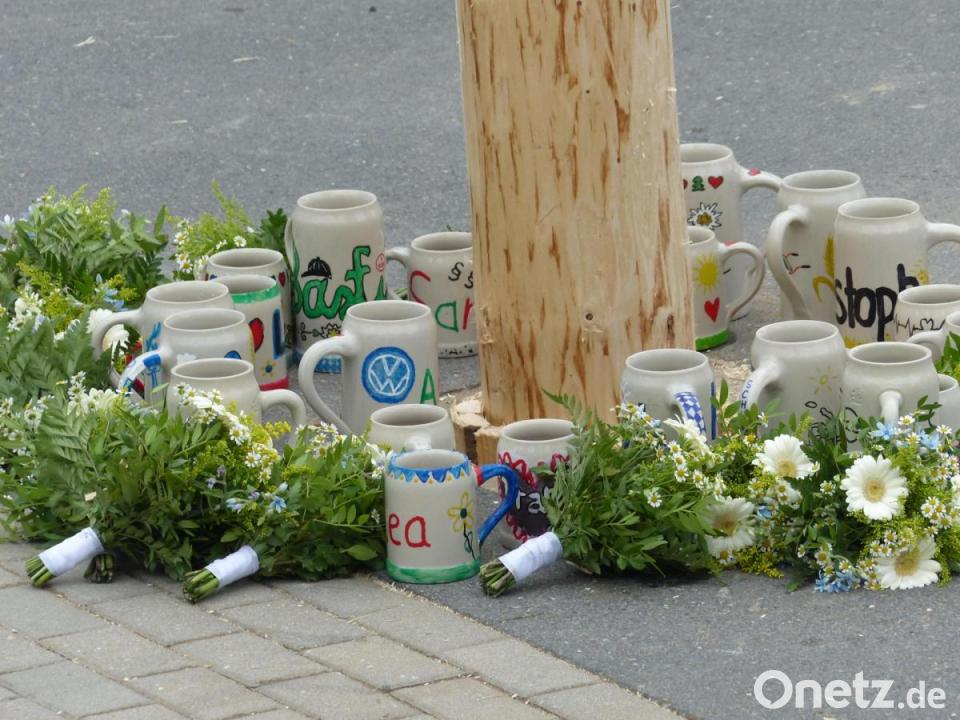 Anschließend wartete schon das Bier auf die Kirwaburschen. Die Moidln hatten eigens Masskrüge für ihre Burschen bemalt. Direkt nach dem Gottesdienst überreichten sie die Kunstobjekte voller Gerstensaft, nachdem sie zuvor von ihren Burschen Blumensträuße bekommen hatten.