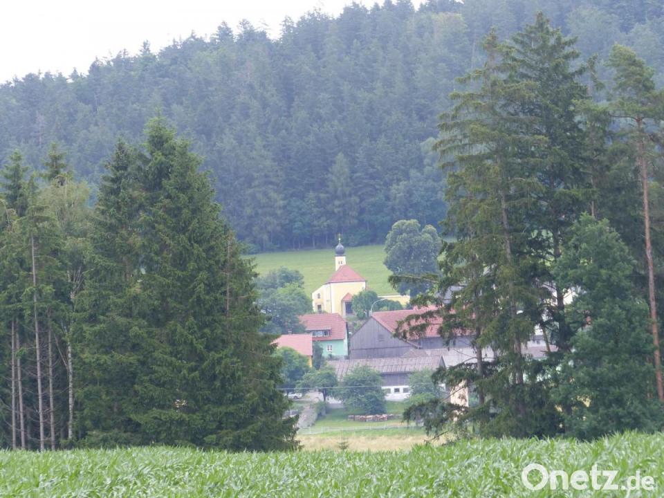 Auf dem Kleßbergerweg von Döllnitz zur B 22 kann dieser Ausblick in Richtung St--Emmeram-Kirche genossen werden. Möglich wurde der Anblick, da im Wald Bäume entfernt wurden und die neuen noch zu klein sind, somit bildet sich eine Schneise für ein wunderbares Panorama. Emmeram-Kirche ist ungefähr vier Kilometer entfernt. Die Filialkirche steht in Woppenrieth, Teil der Marktgemeinde Tännesberg.