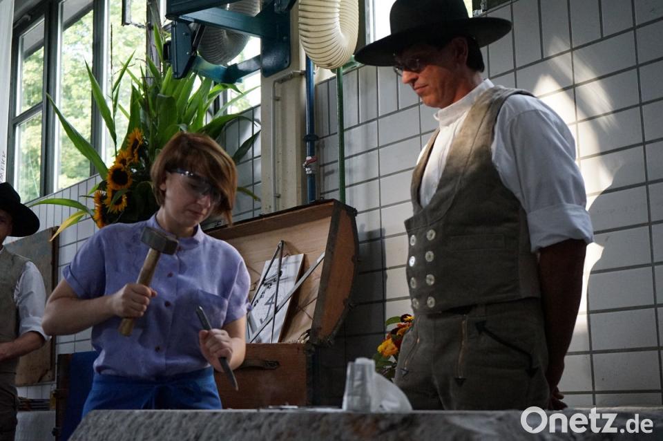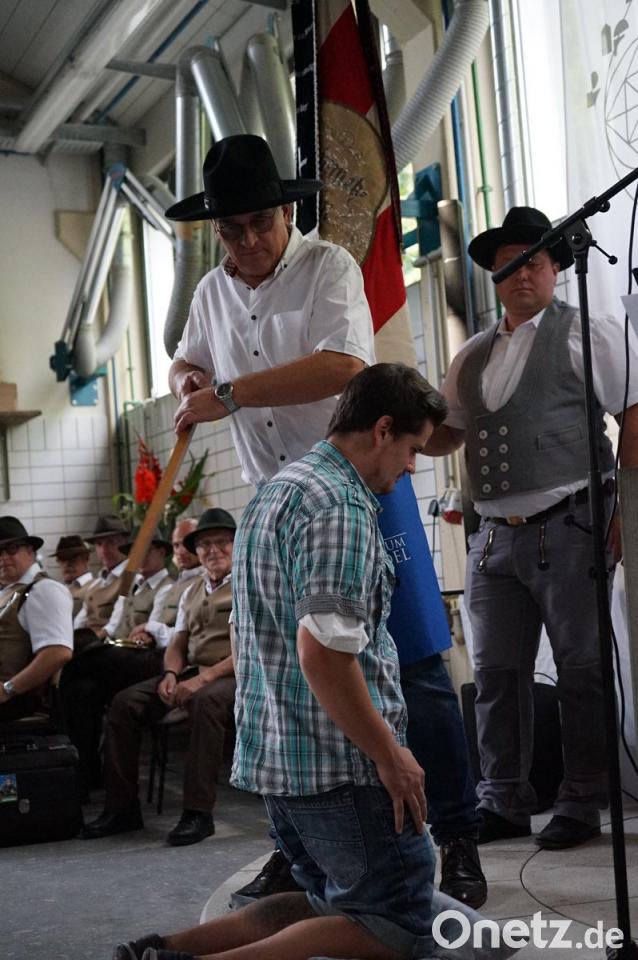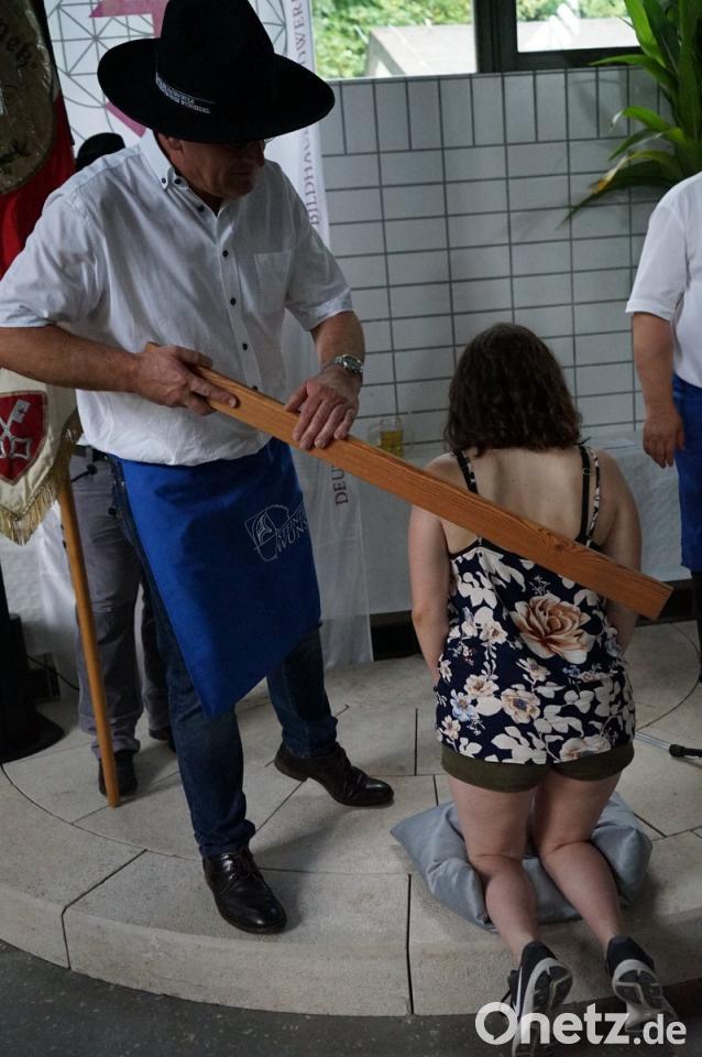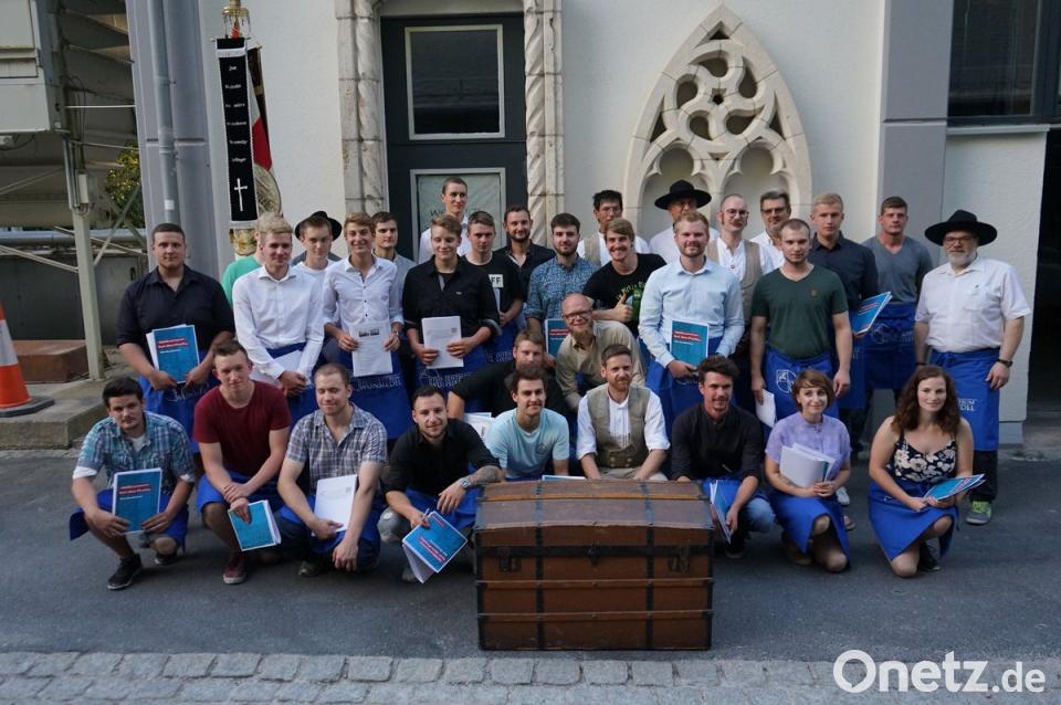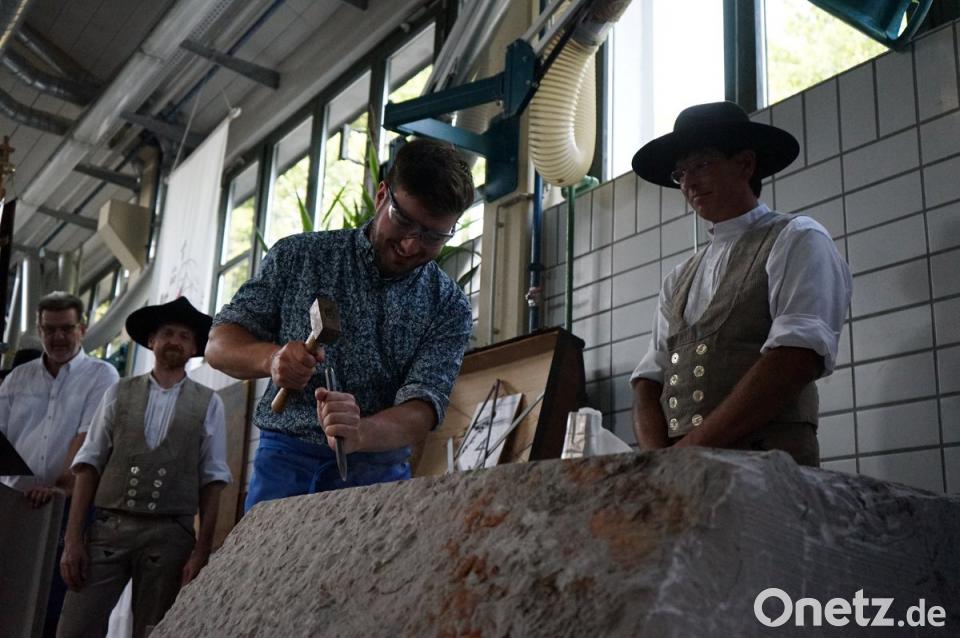 Ein ganz besonderes Ritual darf bei der Freisprechungsfeier nicht fehlen: Die Mundharmonika spielt das Lied vom Tod, die historische Zunftlade steht aufklappt auf einem Sockel und Obermeister Norbert Schlick hält sein stabiles Richtscheit bereit für die Rücken der zukünftigen Gesellinnen und Gesellen. Jeder einzelne Absolvent durfte sich dazu nach Aufruf auf ein Kissen knien. Auch wenn der Rücken etwas schmerzte, als das große Richtscheit auf sie niederfiel - es war ohne Zweifel ein erhebender Moment für die jungen Damen und Herren, als sie mehr oder weniger nachdrücklich vom Lehrlings- in den Gesellenstand befördert wurden. Ausgestattet mit einer neuen Steinmetz-Schürze schritten die jungen Leute dann jeweils einzeln zu einem Steinblock, auf dem sie vor Lehrmeister Klaus Heinl drei Schläge mit Hammer und Meißel durchführten. "Der erste Schlag bedeutet das ruhige Nachdenken. Die zwei Geschwinden bedeuten Fleiß bei der Verrichtung der Arbeit", lautete die klare Ansage. Und erst dann gab es eine Gratulation sowie die Bescheinigung über die bestandene Prüfung und die Abschlusszeugnisse.