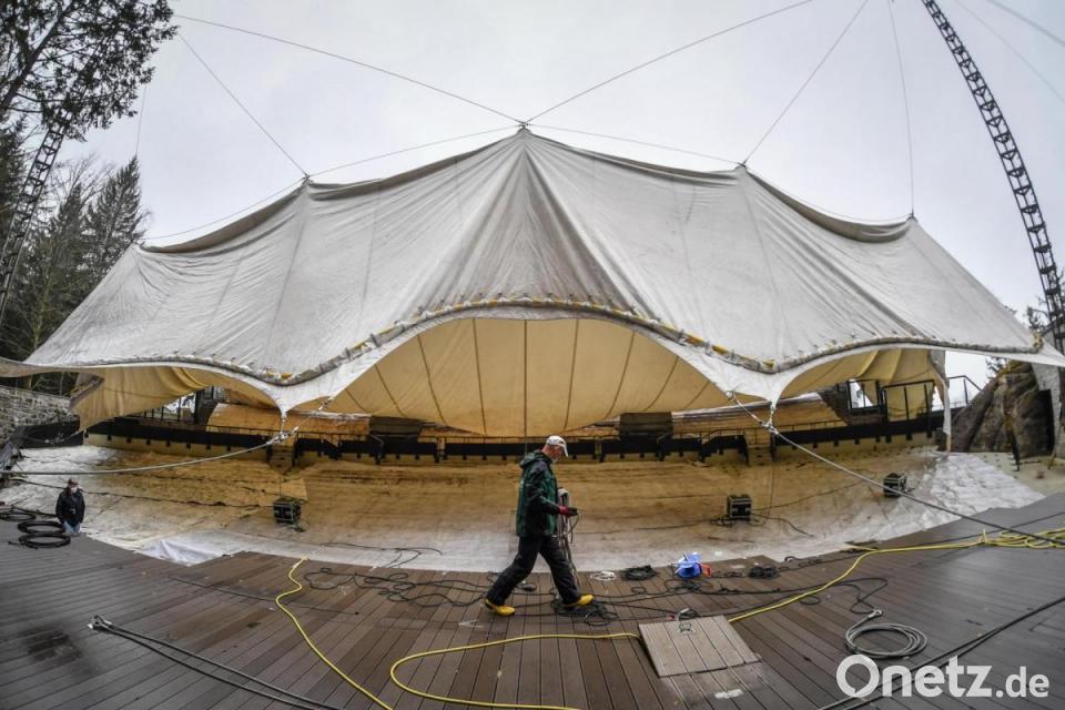 Dieses Schicksal bleibt dem neuen Dach erspart. „Wir lassen es einfach herab und auf die Tribüne gleiten“, erläutert Brunner. Die Membran nimmt bei Regen und Schnee keinen Schaden, wenn sie auf dem festen Untergrund liegt. Die Handwerker müssen auch in Zukunft die Sitzplätze sowie den Beleuchter- und den Tonstand abbauen. Der Aufwand des Herablassens oder Aufziehen des Daches reduziert sich zwar, aber nicht gravierend. Zumindest das aufwendige Zusammenfalten der Membran für die Lagerung in der Holzkiste entfällt.