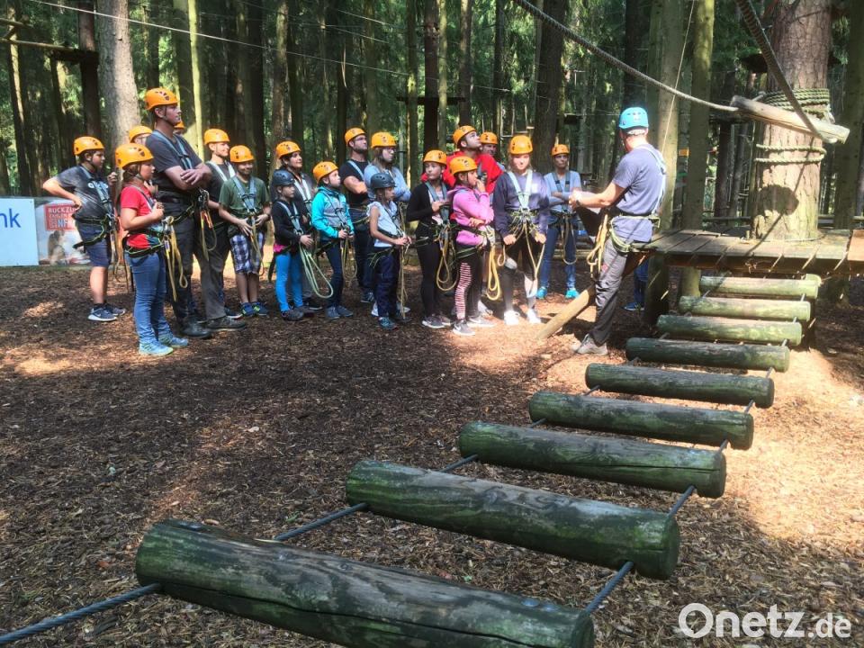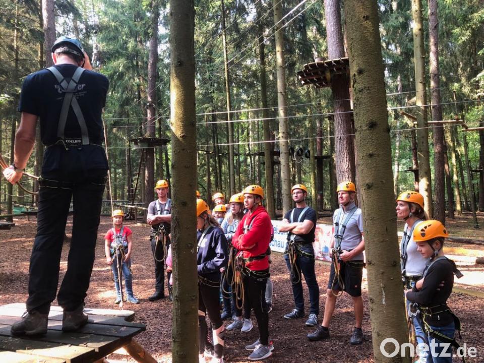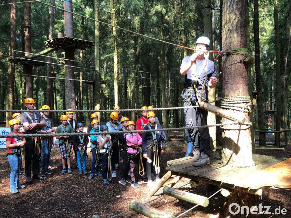 Mit 26 Teilnehmern, davon 15 Kindern im Alter zwischen 6 und 15 Jahren, war die Feuerwehr aus Ilsenbach und Wurz zum verspäteten und letzten Ferienprogrammpunkt in den Hochseilgarten Hirschau eingerückt. Ausgerüstet mit Klettergurten, Helm und Seilen vergnügten sich die Kleinen knapp vier Stunden zwischen den Bäumen. Manfred Prösl mit seinem Team vom Hochseilgarten zeigte den Teilnehmern die Handhabe dieser verschiedenen Strecken. Die höchste Station ist 17 Meter hoch. Farbliche Unterschiede zeigen die Schwierigkeitsgrade.