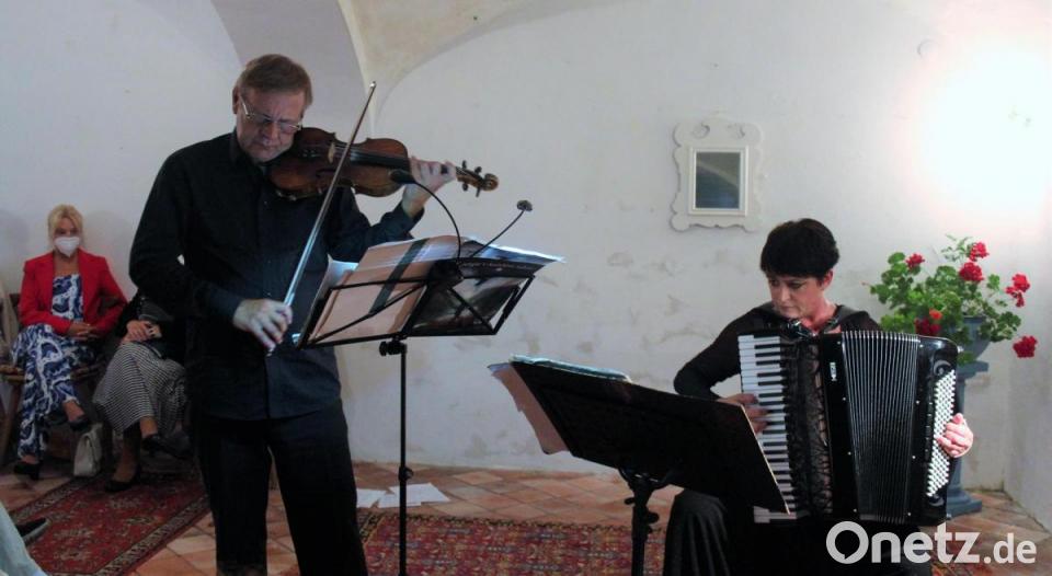 Die 60 Plätze im Gewölbe waren schnell belegt, das Wetter hielt aber den ein oder anderen Musikfreund nicht davon ab, unter einem Zeltpavillon Platz zu nehmen und der Musik zu lauschen. Die beiden renommierten Instrumentalisten aus dem Nachbarland Tschechien schlugen mit ihrem Programm einen großen thematischen Bogen über mehrere Jahrhunderte und mehrere Länder.