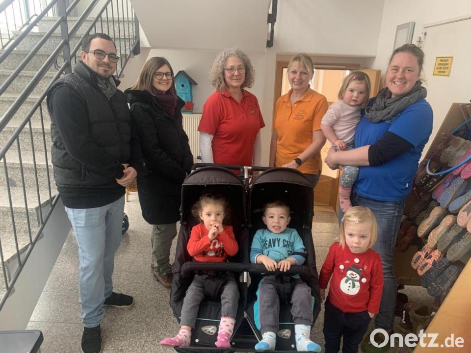 Elternbeiratsvorsitzende Jenny Schmid und Kassier Michael Krall überraschten den Kindergarten St. Matthäus Wurz mit verschiedenen Spenden. Die Sachen wurden aus dem Erlös vom St.-Martin-Umzug beschafft. So durfte die Gruppenleiterin der Kita-Krippe, Melanie Windschiegl, einen hochwertigen Zwillingskinderwagen in Empfang nehmen. Dazu erhalten die "Wurzelkinder" dieser Krippe auch noch zwei Winterfußsäcke für die kalte Jahreszeit.