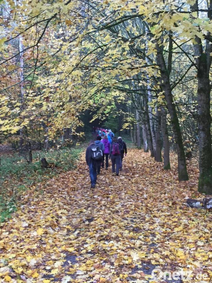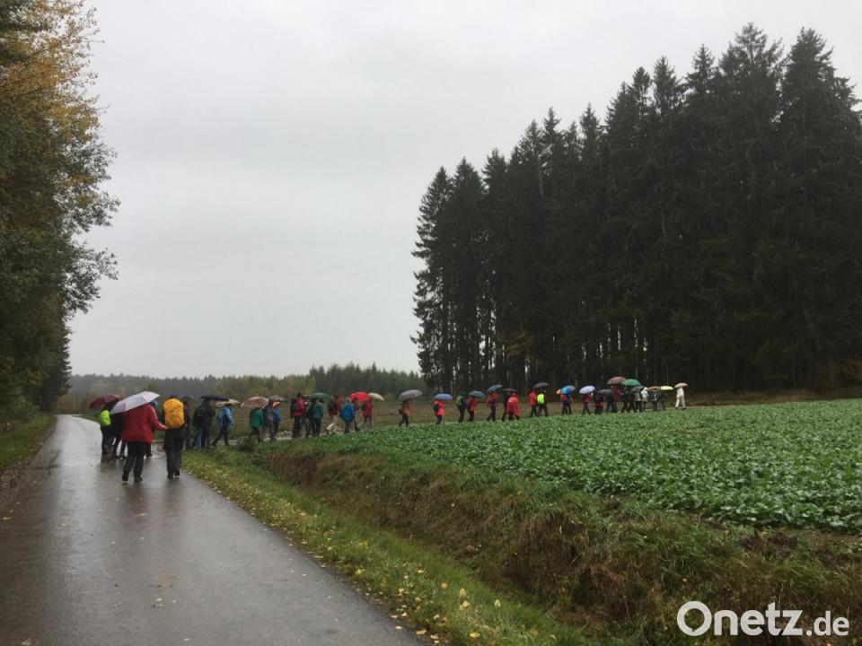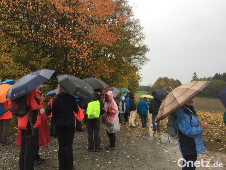 Pünktlich zum Start um 9.30 Uhr sah es noch so aus, als würde die dicke Wolkendecke aufreißen und auch der Regen aufhören. Kaum eine halbe Stunde später mussten jedoch die Schirme und Regenponchos gezückt werden. Schon ab Scherreuth war sich die Gruppe dann einig "etz hat sich's eingrengt". Aber die Stimmung in der fast 50-köpfigen Gruppe - kaum einer hatte sich von der schlechten Wetterprognose im Vorfeld abschrecken lassen - war dennoch gut. Viele angeregte Gespräche und Lachen waren immer wieder zu hören und ließen die steten Regentropfen fast vergessen.