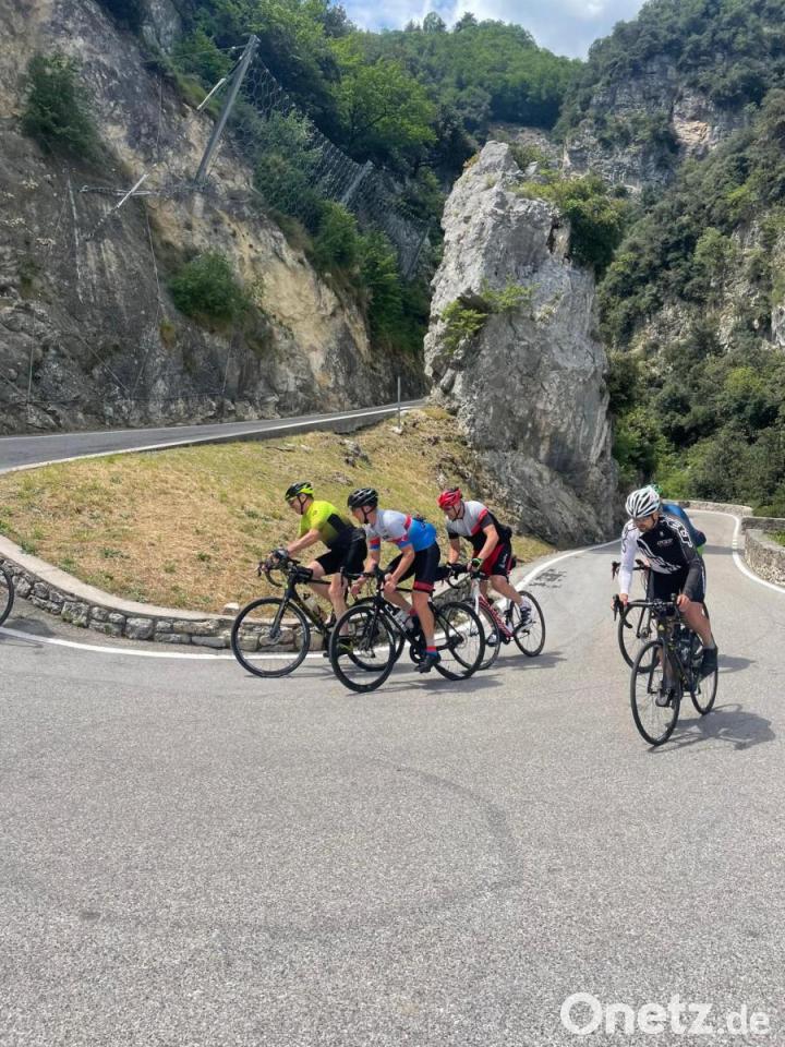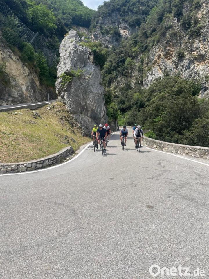 Am dritten Tag erwartete die Radsportfreunde gleich früh am Morgen eine große Herausforderung. Es musste der Jaufenpass mit einer Länge von etwa 15 Kilometern und etwa 1100 Höhenmetern absolviert werden. Am Gipfel herrschten nahezu eisige Temperaturen. Noch einmal Kräfte bündeln war angesagt, da im Anschluss eine 20 Kilometer lange Abfahrt nach Meran auf die Radsportler wartete. Weiter führte die Tour am Kalterer See die Südtiroler Weinstraße entlang. Erste Vorfreude auf den Gardasee machte sich breit. Die währte allerdings nicht lange. Ein heftiges Gewitter zwang das Team, für die letzten Kilometer nach Torbole das Begleitfahrzeug zu nutzen. Die Tour wurde nach 130 Kilometern witterungsbedingt beendet. Im Hotel am Gardasee angekommen, plante die Gruppe gleich Touren am Gardasee. Einmal ging es am Gardasee in Richtung Bardolino, eine Tour mit über 18 Prozent Steigung, 80 Kilometern Länge und 850 Höhenmetern, ein anderes Mal ging es auf der Westseite des Gardasees nach Limone, anschließend führte die Brasa Schlucht hinauf zur Ortschaft Pieve.