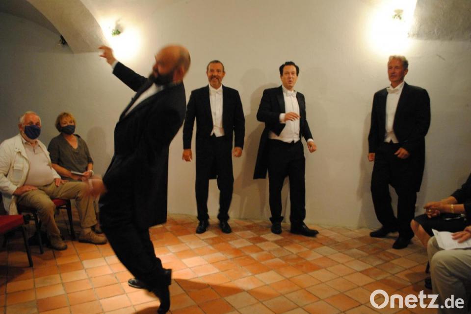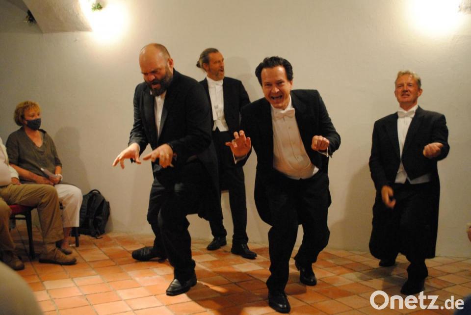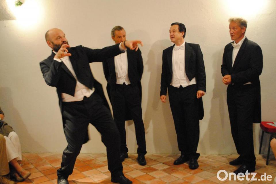 Als Bariton Lorenz Renner das spanische "Un poquito cantas" anstimmt, macht sogar eine dreistimmige Rhythmusgruppe mit temperamentvollem "tschikibubu" und "Olé" Lust, Samba zu tanzen. Nach der Pause dann ein Beinahe-Volkslied: das Regensburg-Lied. "Aber sonst gesund" - wer das nach der Aufzählung der vielen Pillen und Salben noch glaubt, die Tenor Michael Weigert angeblich täglich konsumiert, muss Apotheker sein. Inzwischen hat dieser entdeckt, dass der Gesang in der Mitte des Gewölbes im Marstall lauter klingt und nutzt diesen Umstand bei jeder Gelegenheit. Heiß wird es den Damen, als Bass Albert sich mit mit lasziven Bewegungen seiner Fliege und seiner Jacke entledigt und dabei hüftschwingend singt, wie viel Sex-Appeal er habe. Entsprechend aufgekratzt fällt der Applaus aus.