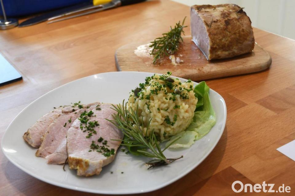 Eine halbe Stunde vor Ende der Garzeit Schalotten und Knoblauch schälen und fein hacken. Die Brühe erhitzen. In einem Topf das übrige Öl erhitzen und darin die Schalotten und den Knoblauch anschwitzen. Den Reis hinzufügen und zirka zwei Minuten mit anbraten. Mit dem Weißwein ablöschen und einkochen lassen. Ab dann, immer wenn der Reis die Flüssigkeit aufgesogen hat, eine Schöpfkelle heiße Brühe hinzufügen und regelmäßig umrühren. Kapern abtropfen, Kräuter waschen und trockenschütteln. Alles fein hacken. Nach 20 Minuten den Reis probieren . "In der Regel ist er nach 22 bis 25 Minuten gar", sagt Michael Schiffer. Wenn er fertig ist die Kräuter, Butter und eventuell noch einige Esslöffel Brühe hinzugeben. Mir Salz und Pfeffer abschmecken. Die Rosmarinzweige vom Braten entfernen. Das Fleisch in Scheiben schneiden und sofort mit dem Kapern-Kräuter-Risotto servieren.
