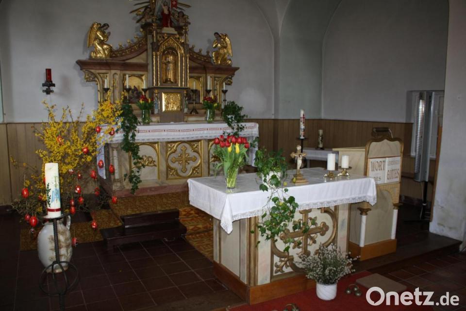 Symbole dafür sind die liebevoll österlich geschmückten Kirchen wie hier die Herz-Jesu-Kirche in Zessau. Die roten Schmuckeier mit christlichen Ostersymbolen und Versen (links an den blühenden Forsythienzweigen), gewissermaßen das „österliche Markenzeichen“ der Trabitzer Kirchen und Kapellen, sind kunstvolle Handarbeiten von Therese Scharf aus Gänsmühle.