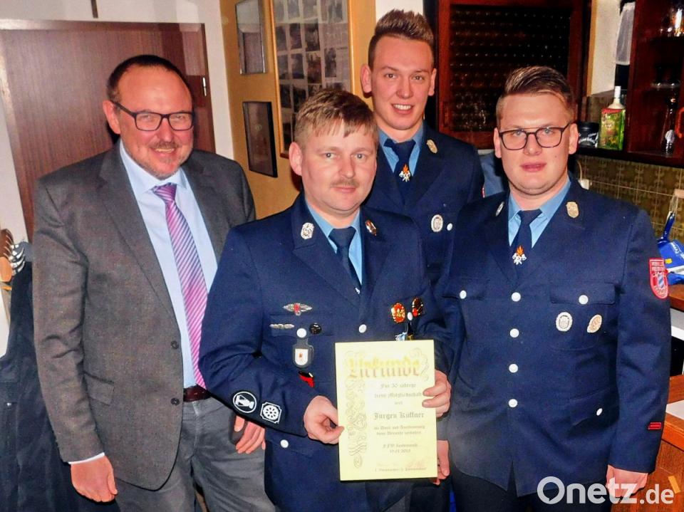 35 Aktive führt Kommandant Jürgen Küffner. Für 30-jährige Mitgliedschaft ehrten ihn zweiter Bürgermeister Rudi Heier, Vorsitzenden Maximilian Reiß und dessen Stellvertreter Christian Nerlich. 60 Jahre dabei ist Werner Krauß.