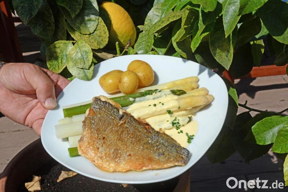 Die Doraden-Filets mit Salz, Pfeffer, etwas Zitronensaft und Worchester-Sauce würzen. In Mehl wenden und zuerst auf der Hautseite etwa drei Minuten anbraten, wenden und auf der anderen Seite ebenfalls drei Minuten braten. Den Spargel auf Teller anrichten und mit der Zitronen-Hollandaise überziehen. Die Doraden-Filets auf den Spargel aufsetzen. Mit den Petersilienkartoffeln servieren. (dt)