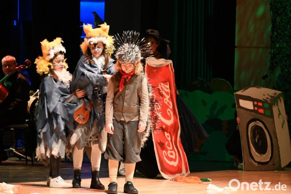 Cornelia Kick hatte ihre Schauspieltruppe erneut in Hochform gebracht. Unterstützt wurden sie von dem singenden Erzähler János Kapitány vom Turmtheater Regensburg. So machten sich die beiden kleinen Eulen, bezaubernd dargestellt von Marlene Mühlbauer und Julieta Noriega Pinedo, auf, die Gefühlswelt der Musik zu erkunden. Vom Tausendfüßler Katharina Stangl bekamen die beiden eine Ukulele geschenkt und wollten in ihrem Wald dann herausfinden, wie man ein eigenes Lied schreibt. So landeten sie zuerst im Nest der Eichhörnchen Elisa Quandt und Evelyn Kulikaev, die ihnen die Liebe in der Musik präsentierten. Weiter ging es zum Igel Merle Eberhardt, den die Eulen vom Müll im Wald erst einmal befreien mussten. Er sang sich dann die Wut vom Leibe.