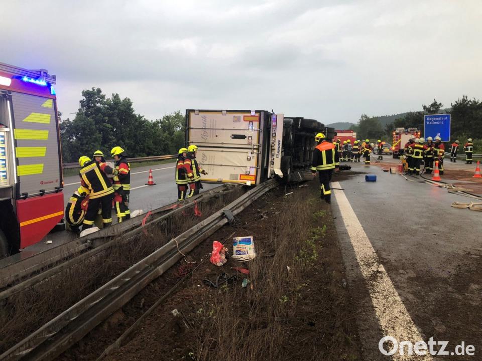 Wie die Polizei auf Nachfrage mitteilte, kollidierten am Mittwochabend ein Laster und ein Auto auf der A93 zwischen Ponholz und Regenstauf in Fahrtrichtung Regensburg. Der Lastwagen, vollbeladen mit Eiern, krachte in die Mittelleitplanke - und kippte um. Er hängt über der Leitplanke. Die Feuerwehren aus Regenstauf, Diesenbach und Ponholz konnten den eingeschlossenen 56-jährigen Fahrer schnell befreien.
