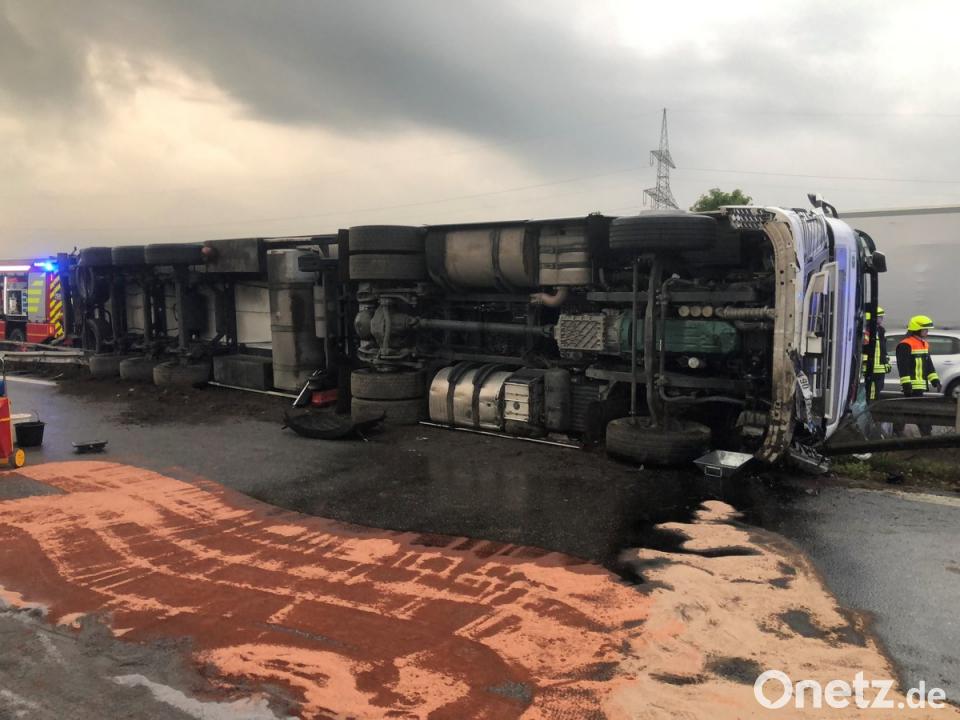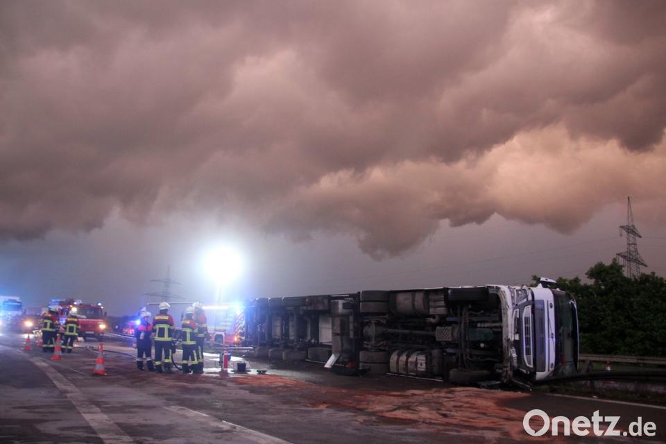 Während der Unfallaufnahme überschattete die Arbeiten der Einsatzkräfte eine spektakulär aufziehende Gewitterfront. Nur wenige Minuten später ergoss sich einige Minuten lang Starkregen über die Einsatzkräfte auf der Autobahn. Es entstand Sachschaden in Höhe von ca. 90.000 Euro. Der Pkw wurde abgeschleppt, der Sattelzug musste von einem Bergedienst mit Hilfe mehrerer Kräne geborgen werden.